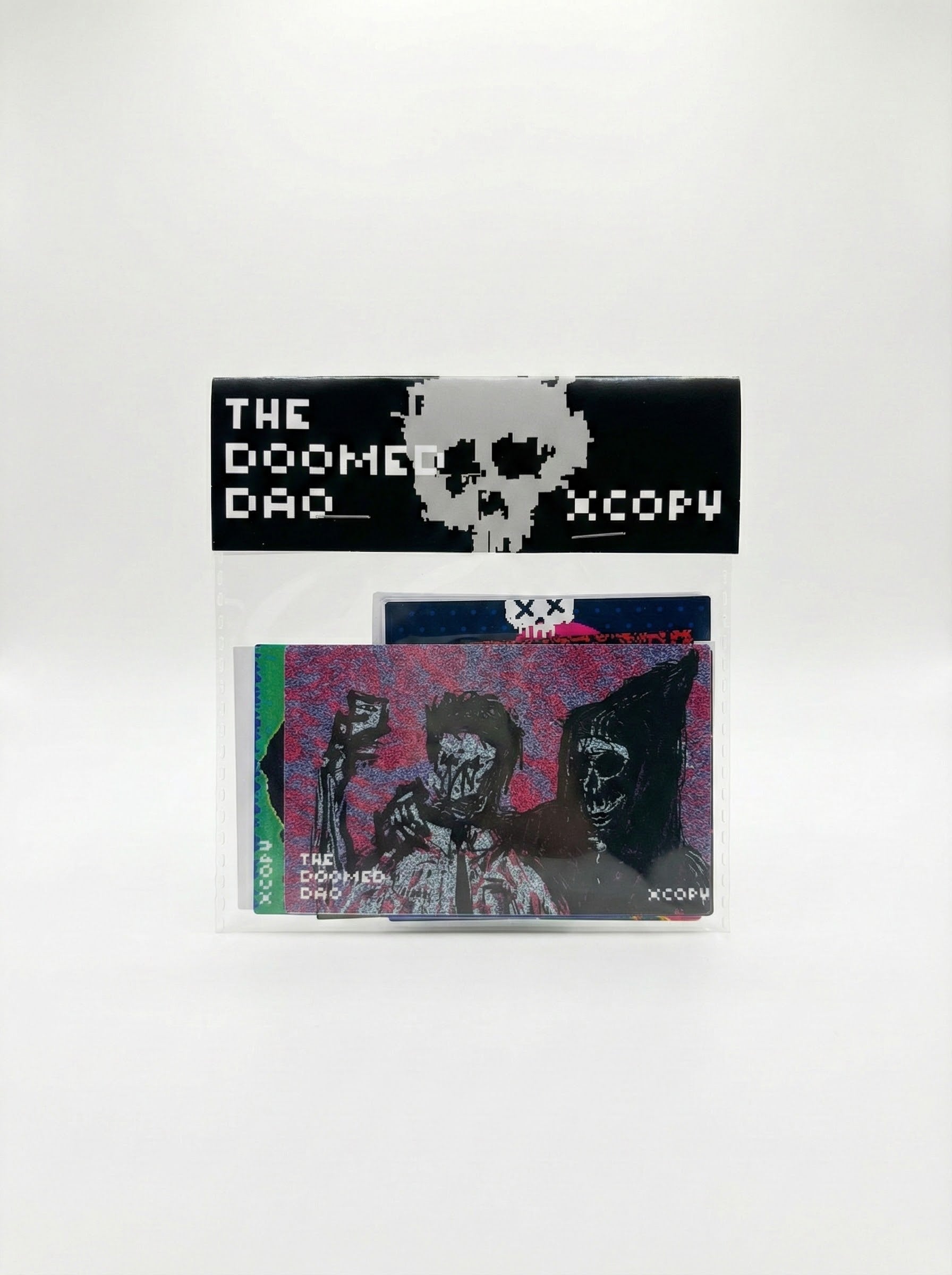 Pack of nine Doomed DAO x XCOPY stickers including Dankrupt, Loading New Conflict, Last Selfie, Coin for the Ferryman, Mortal, Doomed DAO token art, Doomed, RCSAG, Disintegration, Empire Things
